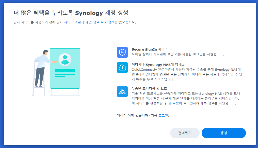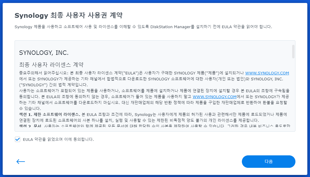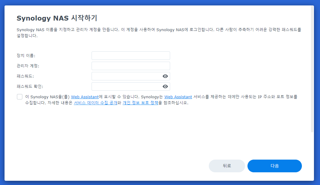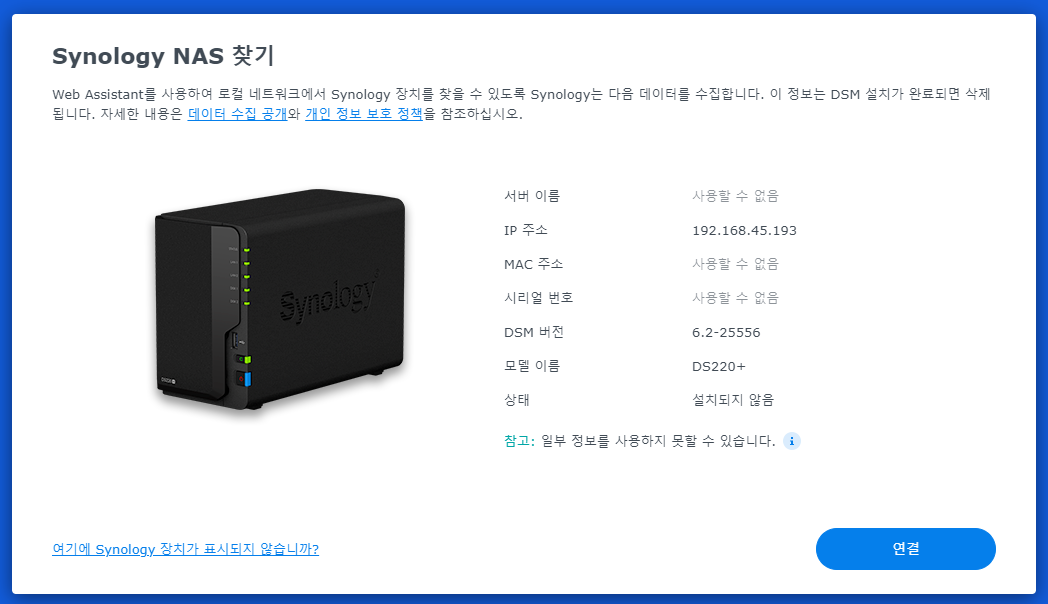 랜선과 전원을 연결하고 동일 네트워크의 디바이스에서 find.synology.com 에 접속하면 자동으로 NAS를 찾아준다.